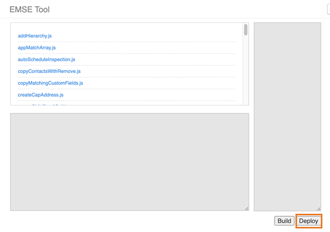 When the right side of the window shows the compiled INCLUDES_CUSTOM script, select Deploy to pull the INCLUDES_CUSTOM script into Civic Platform.