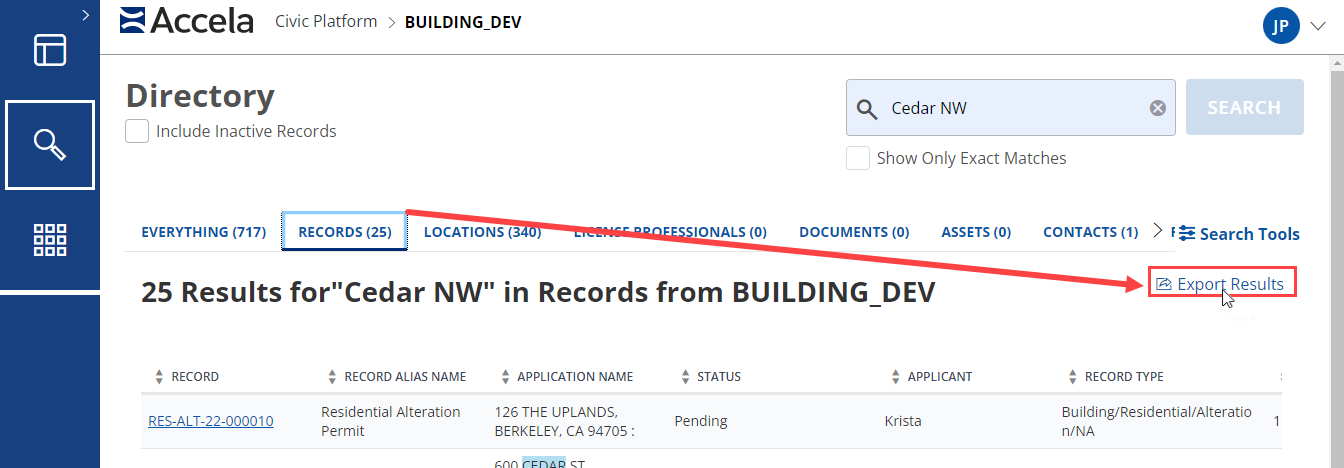 Only search results on the Records tab can be exported. The export format is CSV (comma separated values), which can be read by spreadsheet applications such as Excel or Google Sheets.