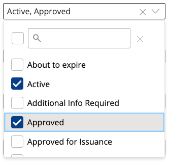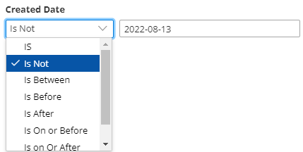 Operator Search result Contains Include results where the field contains the search term(s) anywhere. Starts with Include results where the field begins with the search term(s). Ends with Include results where the field ends with the search term(s). IS Include results where the field is equal to the search term(s). Is Not Include results where the field is not equal to the search term(s). Is Any Of Include results that match multiple search terms. These search terms may be selected from a calendar or list. They may also be typed in the field, separated by commas. Is Before Numeric or date only. Include results that are before the date or number specified. Is After Numeric or date only. Include results that are after the date or number specified. Is On or Before Numeric or date only. Include results that are on or before the date or number specified. Is On or After Numeric or date only. Include results that are on or after the date or number specified. Is Between Include results that are between two values. Use commas to separate the two values. -