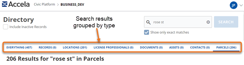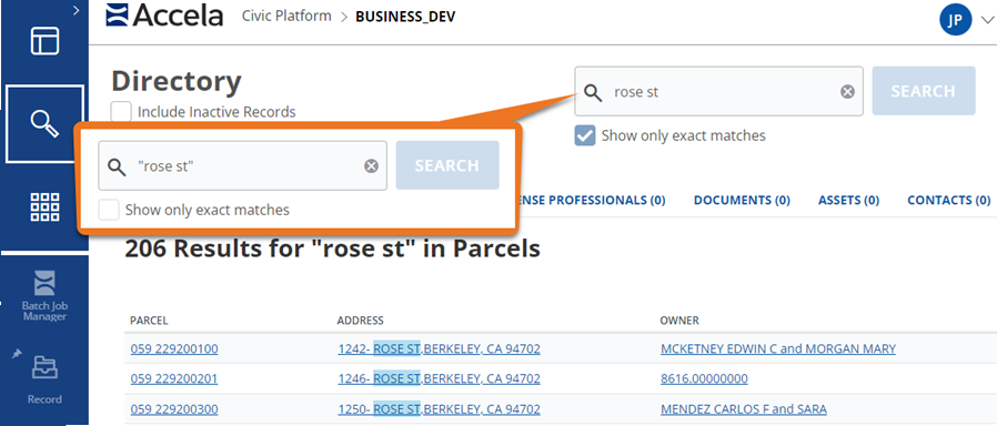 Global search offers the following advanced search features to help you narrow your search in Civic Platform.