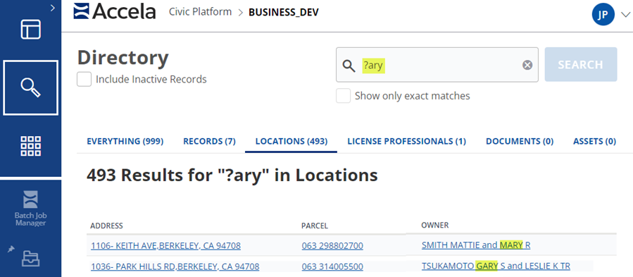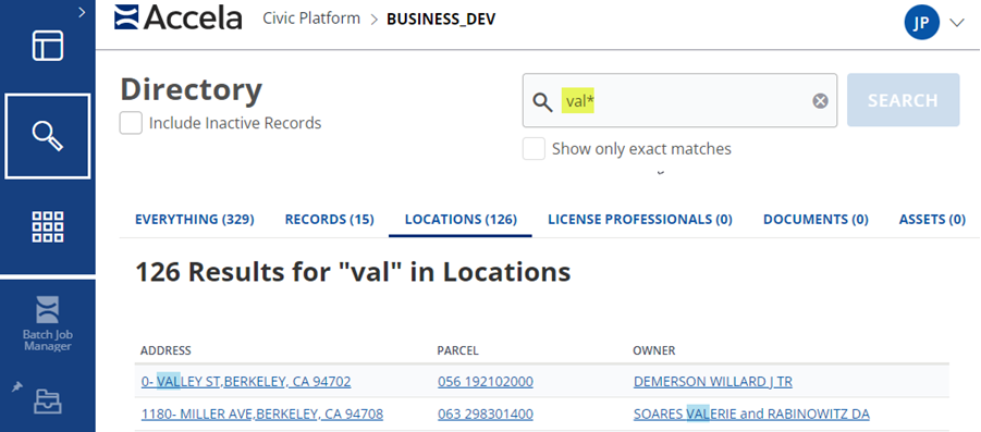Note: In previous versions of Civic Platform, global search used the percent symbol (%) as a wildcard. The asterisk (*) replaces this wildcard.