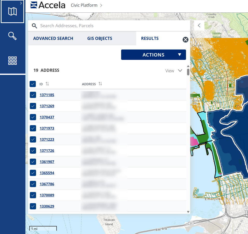 - Results tab — Lists the parcels, assets, and transactional records that are associated with the selected GIS objects on the map. This tab is refreshed when you select or deselect items on the GIS objects tab or when you select more objects on the map.