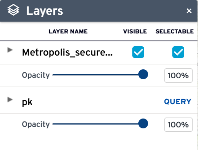 The Layers option allows you to set the visible and selectable attributes of the map layers. It displays the various map services and layers on the map. When you select the Layersoption for the first time, the option displays the map services you have access to, and whether those services are visible or selectable.
