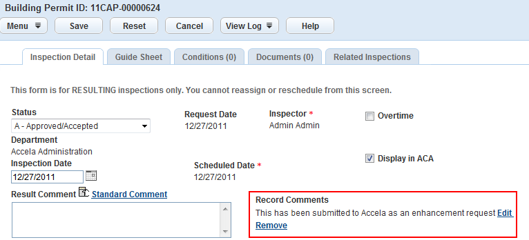 Select the Apply to inspections option to display the comment in the Record comments field of inspections associated with the record.