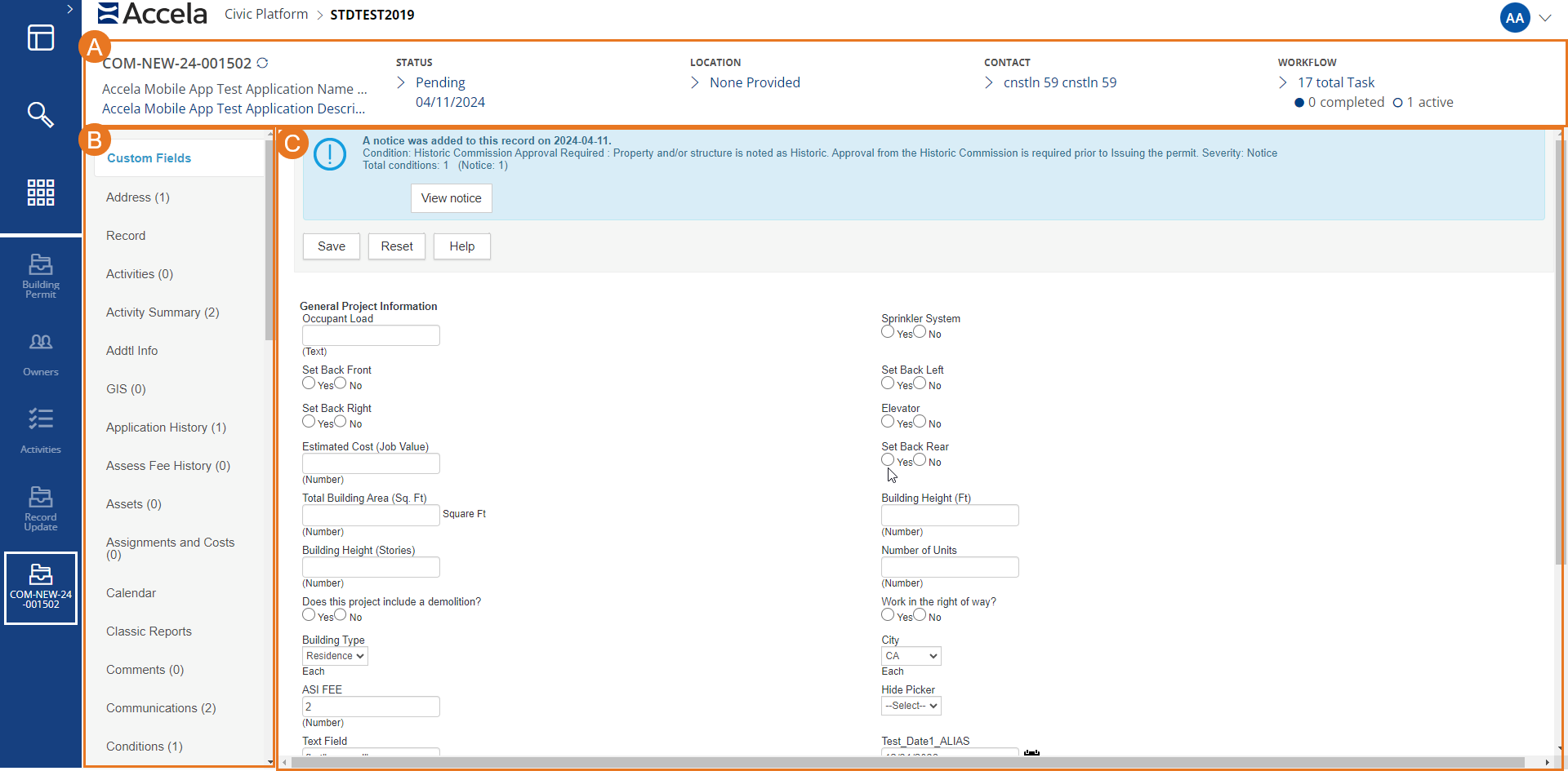 Record body The record body consists of fields and information. Record fields can be different according to how your agency configured that particular record type. If you have question about the fields in a record, contact your agency administrator or help desk. |